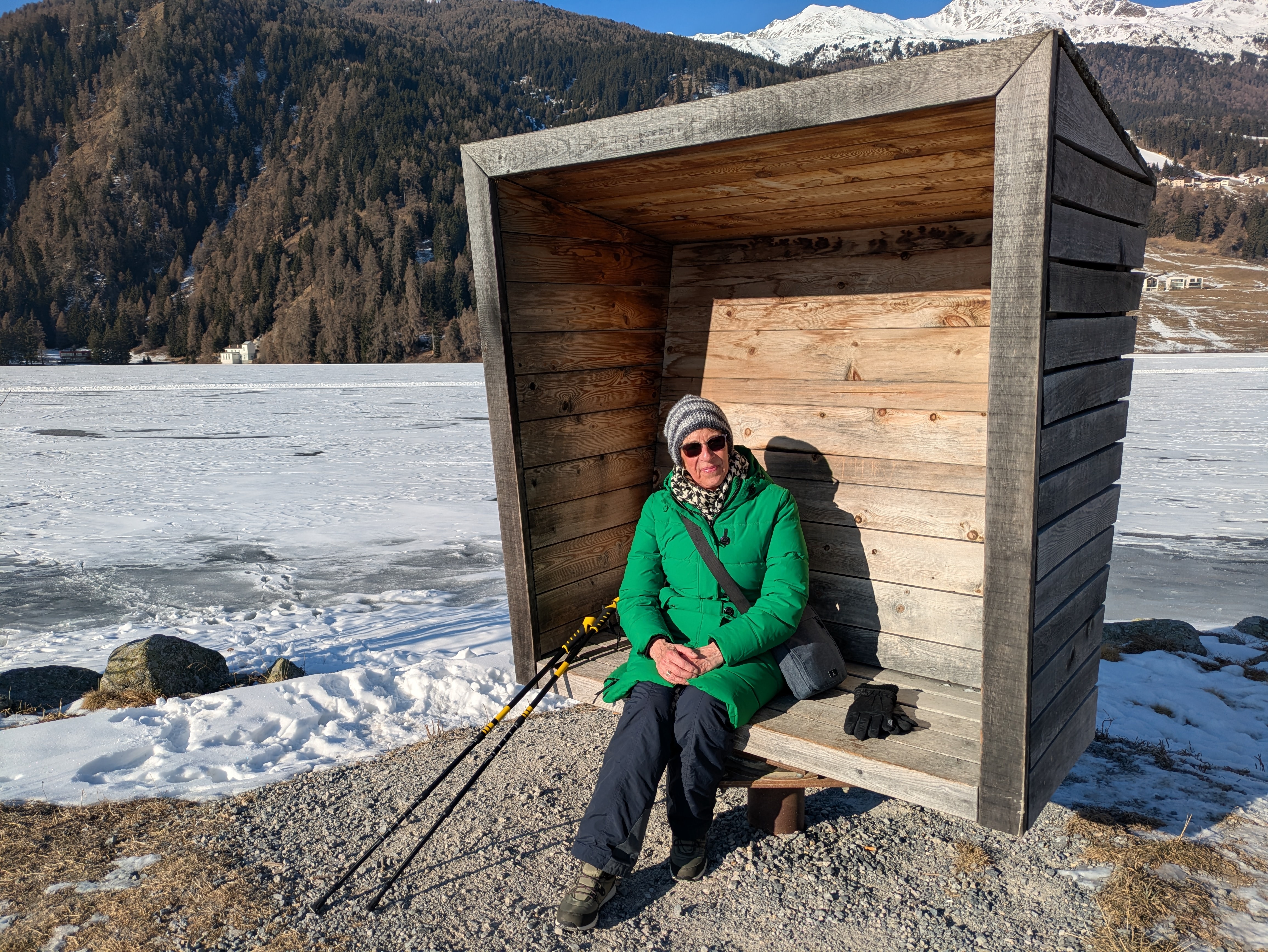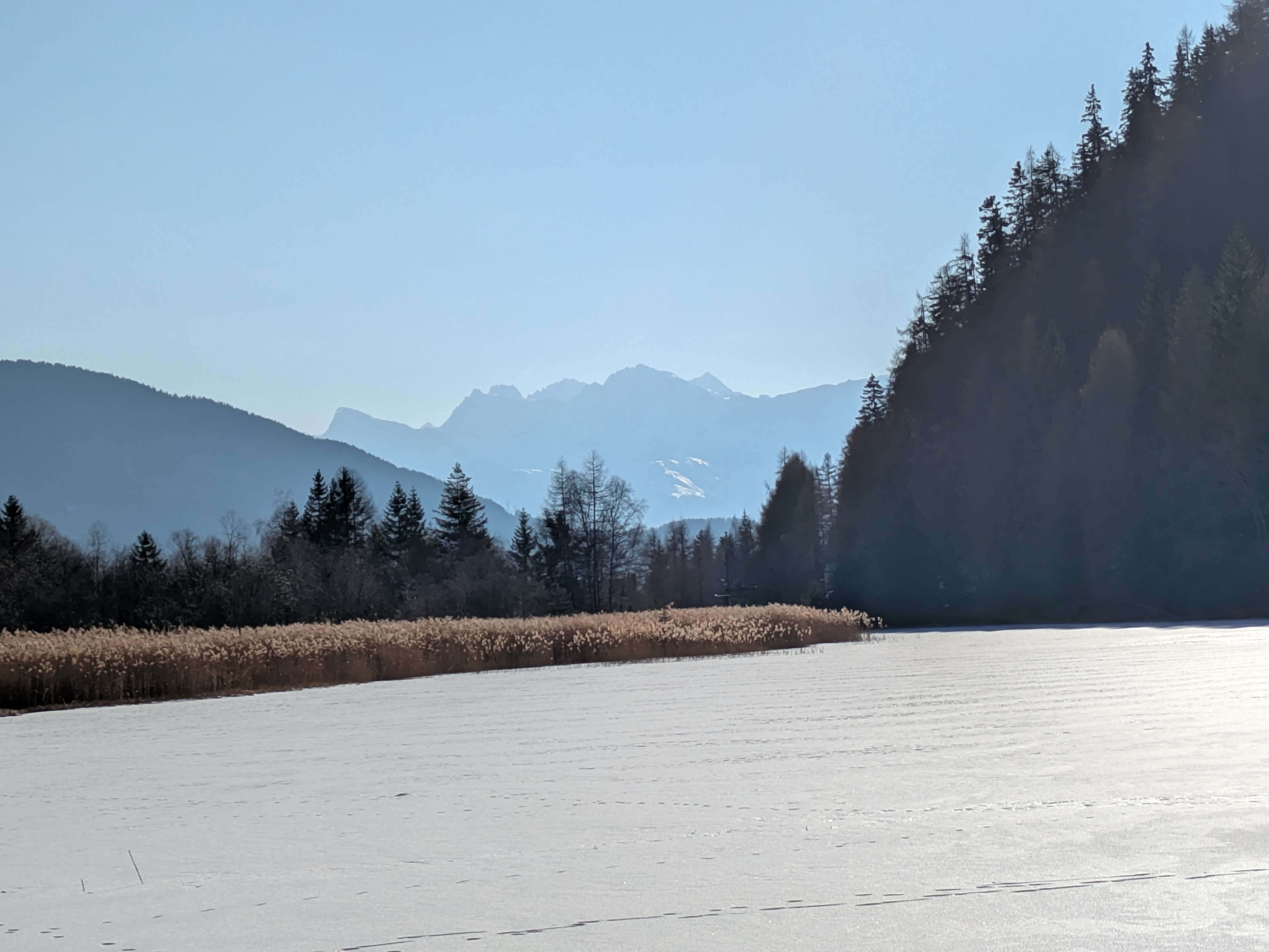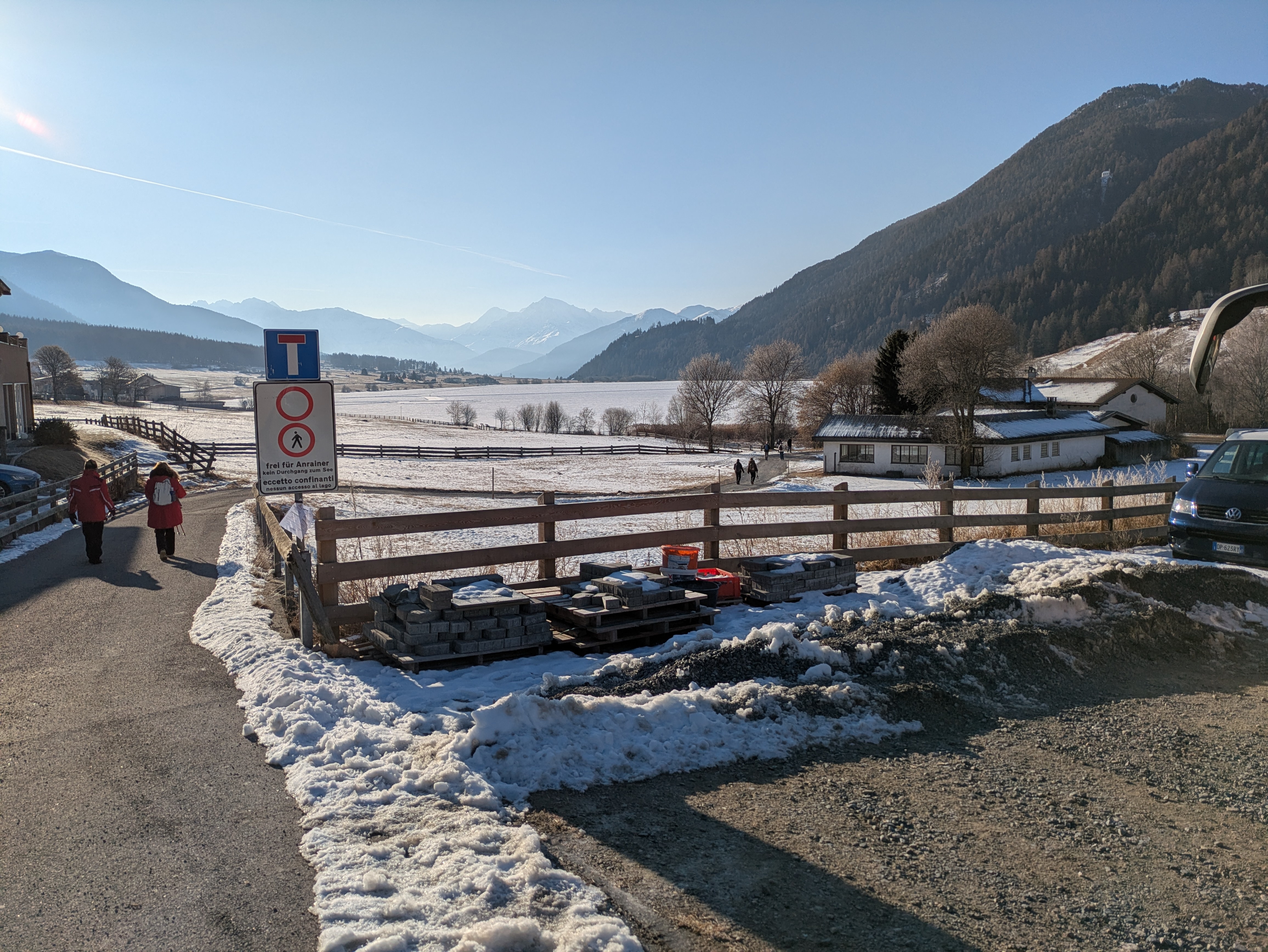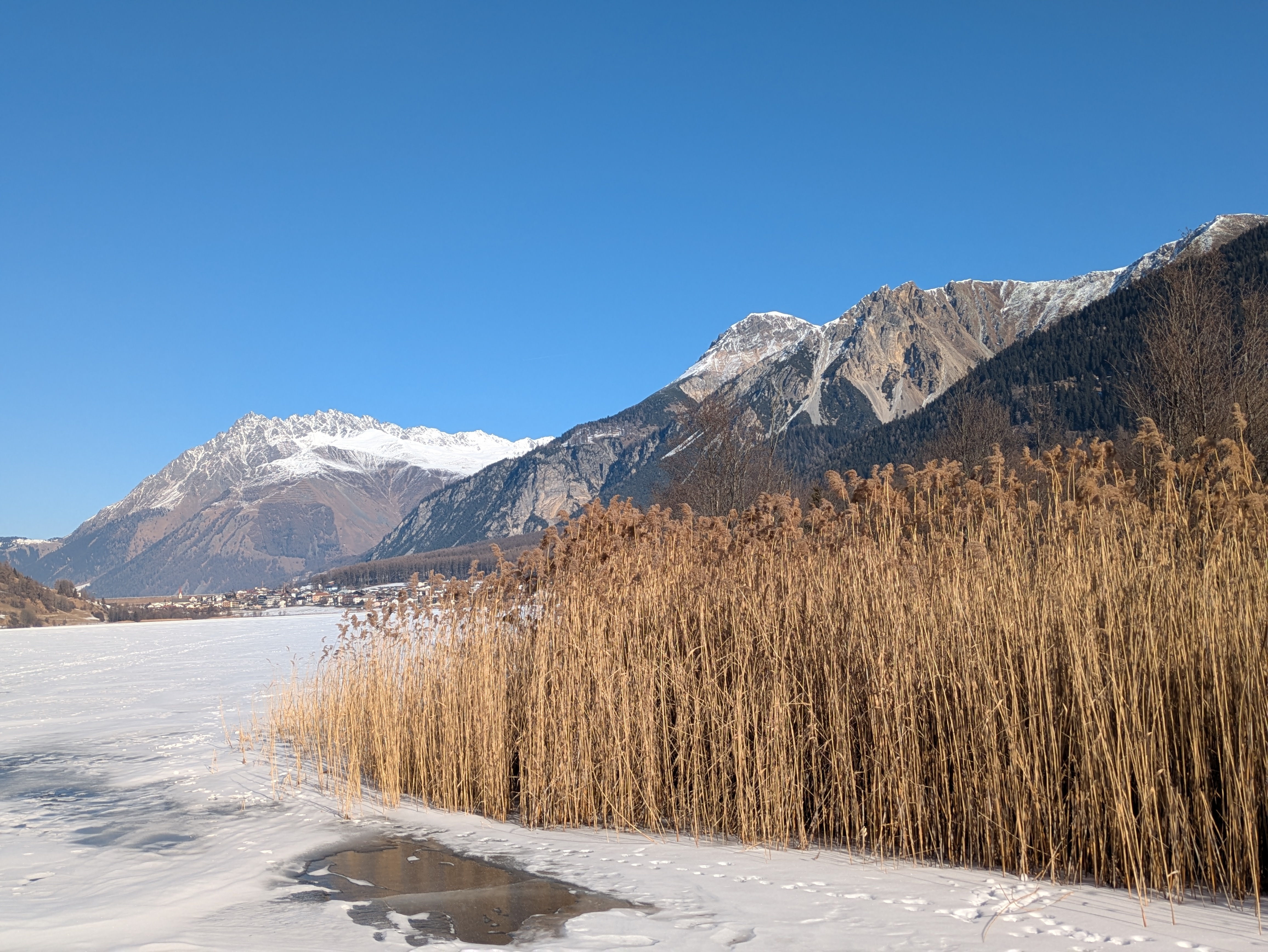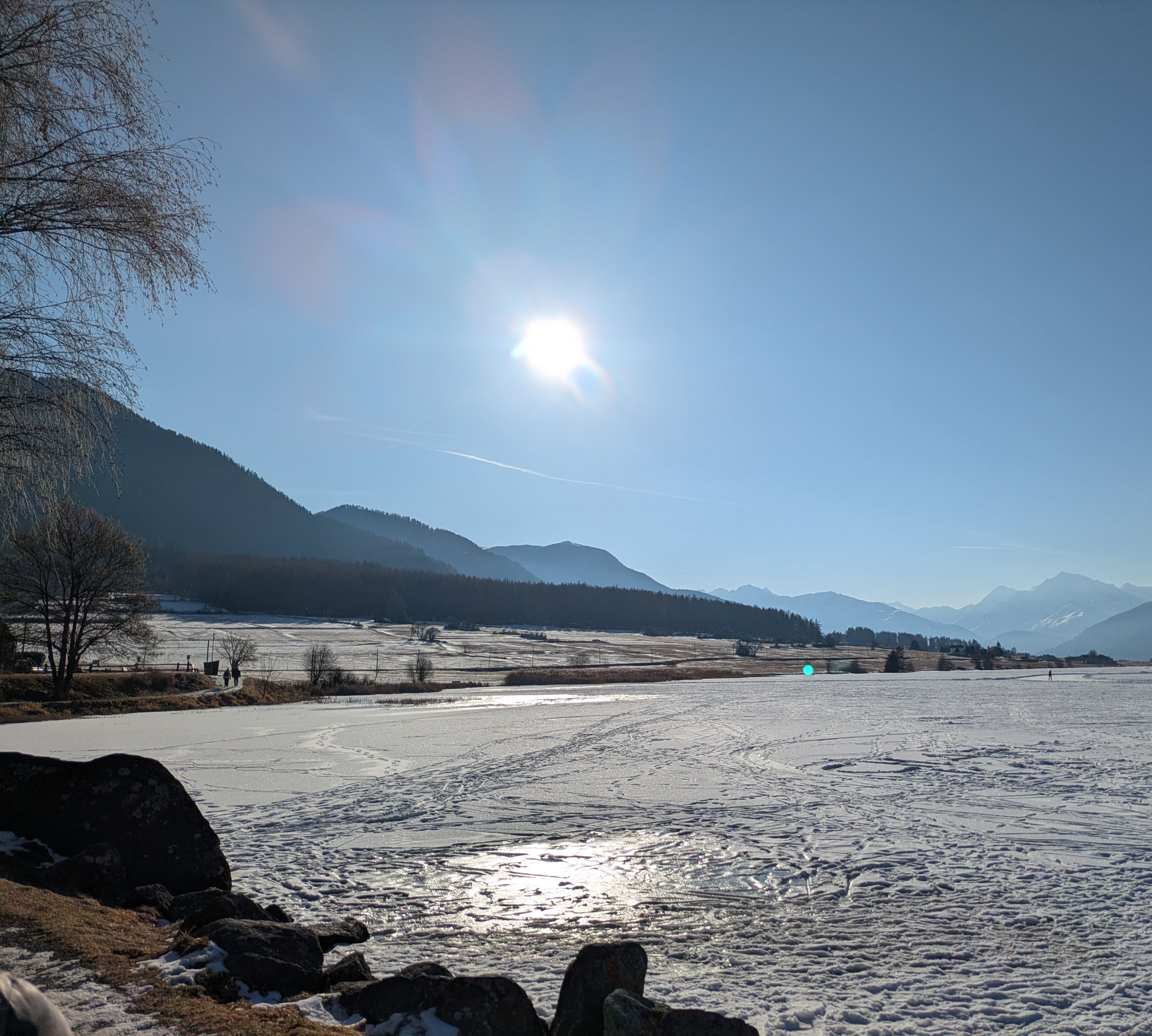 Op dinsdag heeft onze chauffeur ons een dagje naar San Valentino gebracht. Een plaatsje net over de Italiaanse grens op ongeveer twintig minuten rijden vanaf Nauders. Het was onvervalst ‘Kaiserwetter’, strakblauwe lucht en een heerlijk zonnetje. Een deel van de groep probeerde hier de pistes uit en de meeste wandelaars hebben een rondje om de Haidersee gewandeld. Na de wandeling genoten van een welverdiende lunch en aan het einde van de middag terug naar het hotel.