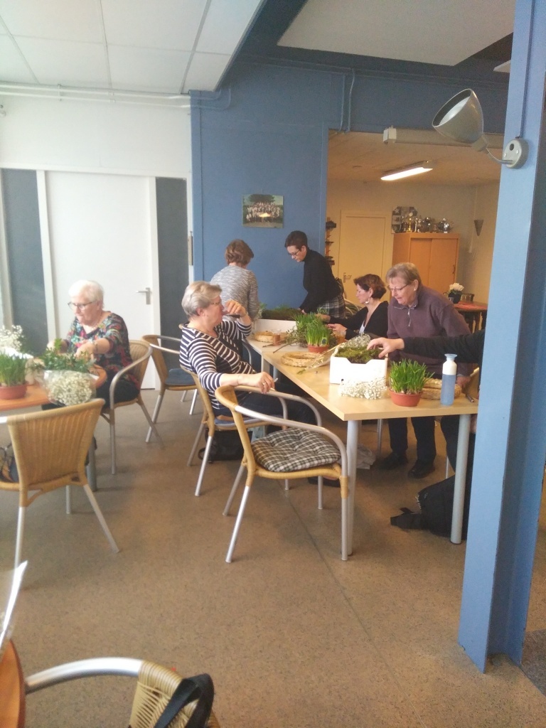 Een gezellige zaterdagochtend was het in ons verenigigingsgebouw op 6 april. Een groep van 18 deelnemers ging na de heldere uitleg aan de slag met een krans, eiderdoppen, bolletjes en gipskruid.